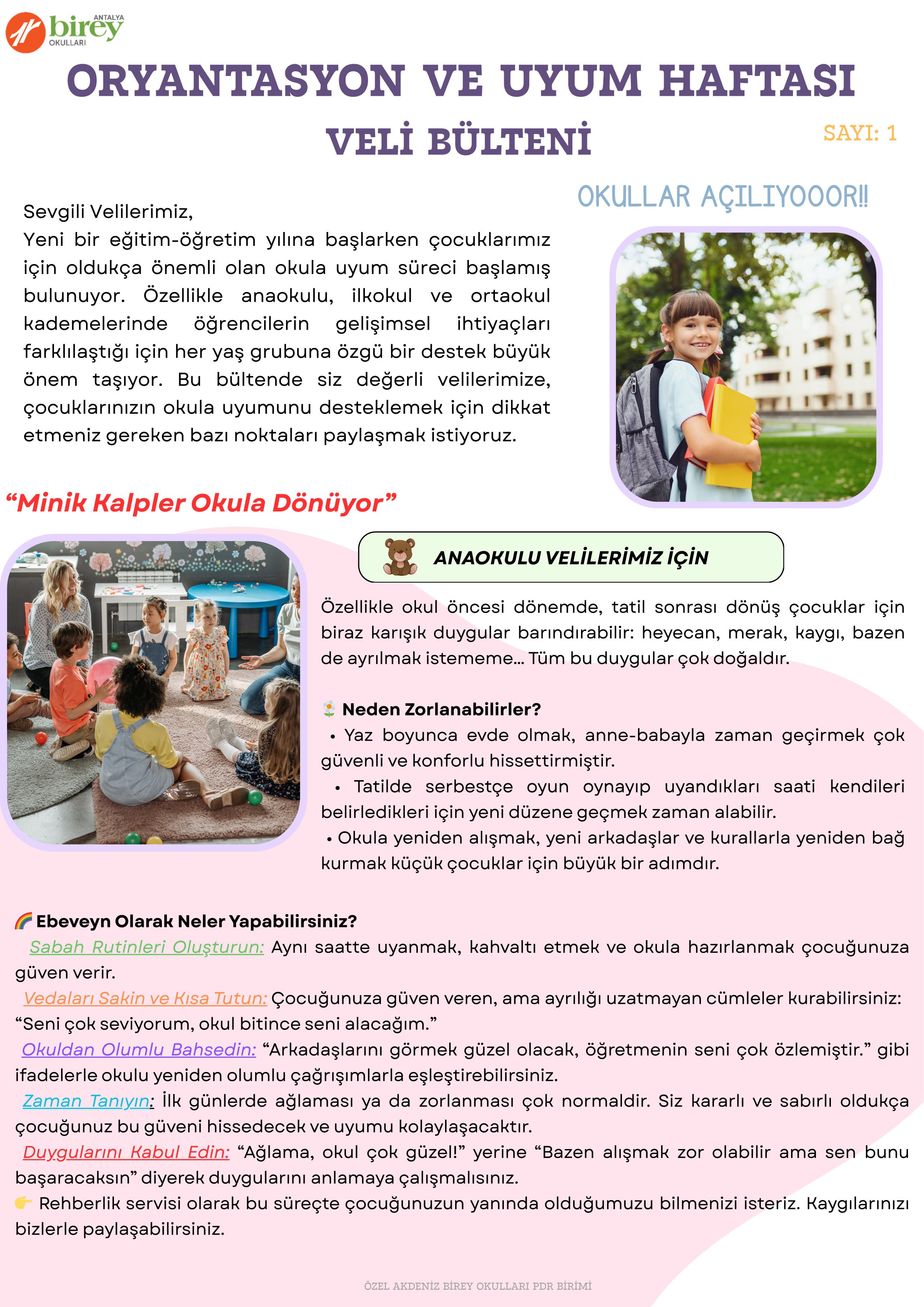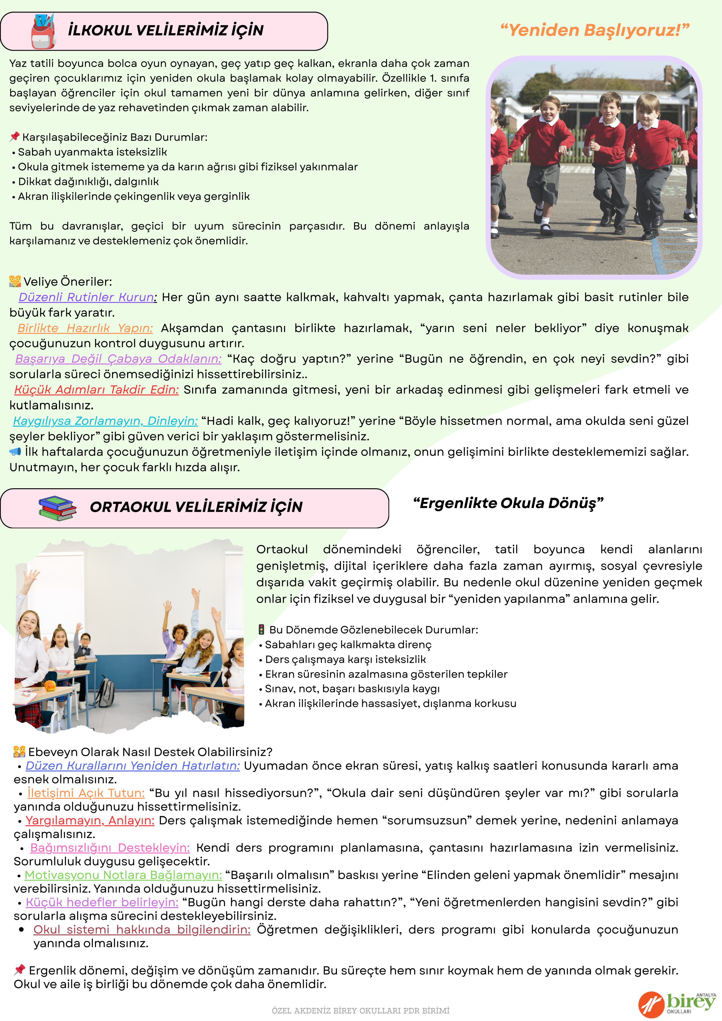 Uzun bir yaz tatili sürecini geride bıraktık ve okulumuza geri döndüğümüz bu günlerde hepimizi yeni bir başlangıcın heyecanı sarmakta. Her eğitim ve öğretim yılının başlangıcı heyecanlar ve aynı zamanda farklı kaygıları da beraberinde getirir. Özellikle uzun bir tatil süreci sonrası okula geri dönüş uyum sağlama sürecinde bazı zorlanmaların yaşanmasına sebep olabilir. Bu zorlanmalar yalnızca okula yeni başlayan çocuklarda değil tüm öğrencilerde görülebilir. Çünkü tatilin kendi içinde var olan düzeninden çıkıp bir anda tekrardan okul sürecine uyum sağlamak çocuklarımız için zorlayıcı olabilir. Bu süreçte onların duygularını anlamamız ve destek olmamız uyum sürecini kolaylaştıran en önemli etkendir.